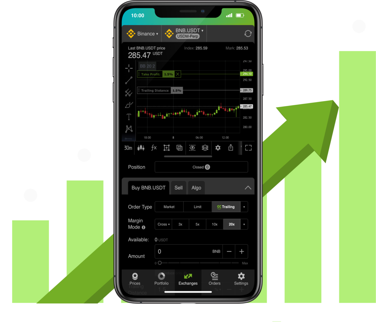 Nell’app GoodCrypto è possibile utilizzare tutte le strategie di Binance Trailing Stop sui mercati dei futures e operare con una leva fino a 125x. Allegate gli ordini Binance Trailing Sell/Buy per i futures di Binance per entrare e uscire dalle operazioni ai prezzi migliori. Regolate l’ordine di trailing stop loss di Binance futures per salvare il vostro portafoglio da drawdown inattesi senza limitare l’upside, oppure impostate un ordine di Trailing Take Profit Binance per i mercati future per aumentare il vostro profitto. Provateli subito e approfittate delle varie opportunità di trading sul mercato.