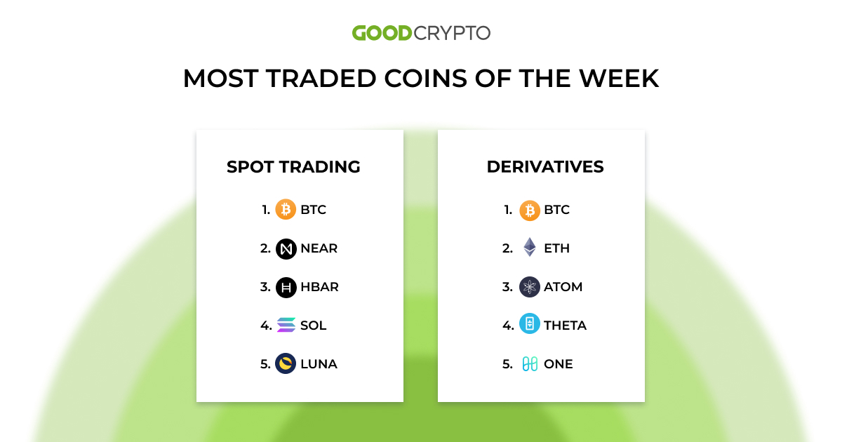 - Spot trading: On the spot trading front, Bitcoin (BTC) and NEAR Protocol (NEAR) have become top dogs. Hedera (HBAR) is following these two head on with Solana (SOL) and Terra (LUNA) taking fourth and fifth places.