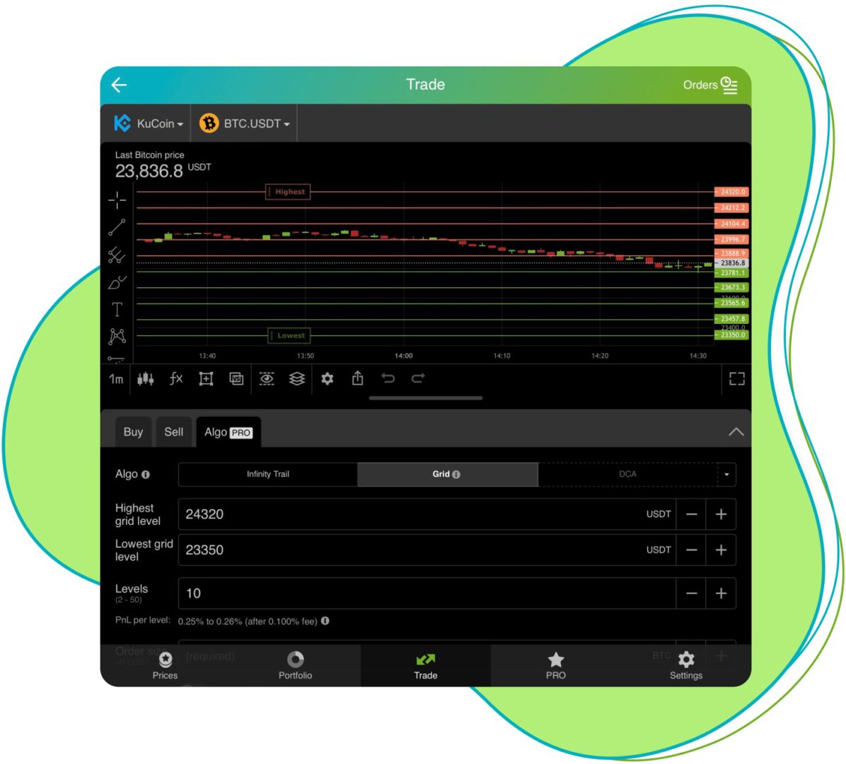 Choose the best KuCoin margin trading bot for any KuCoin trading bot strategy to earn even more regardless of the market direction. Long Grid bot and DCA for uptrending markets, Short Grid bot or DCA for downtrending ones, and Neutral Grid or Infinity Trail, where the price fluctuates in a range.